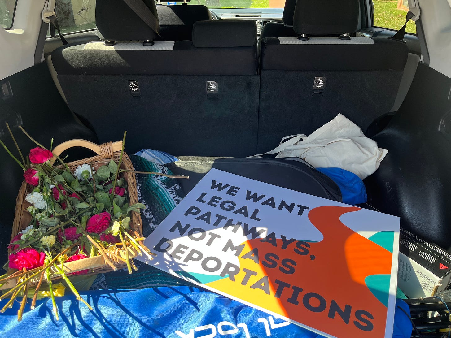I opened the trunk to my aunt’s car, eager to launch my luggage onto the soft black fabric and rush to the airport. To my surprise, a box of fuchsia and pearly white flowers, tangled up in one another’s thorns, lay there instead. Beside the flowers, a large colorful sign read “We want legal pathways, not mass deportations.”